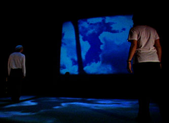 The installation "Skies" within the "Captured Moments" series involves interactions with nature. Visitors encounter four channels of sound and moving video imagery, 7 by 5m, projected onto the floor. The installation is larger than the projected imagery, permitting visitors to walk onto the imagery or in the surrounding area. When no visitors stand on the projection, the imagery presents a night sky containing a moon, covered with slow moving clouds. Upon entering the imagery, visitors discover paths appearing under their feet at specific locations. If a visitor walks down a path, the night imagery will transform into a new type of imagery. When a single visitor walks off a path, the path and associated imagery will immediately disappear, and the night sky will return until another path is located. Thirty-two different video sequences and sound tracks are contained within the installation, their selection determined by the number and location of viewers.