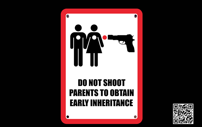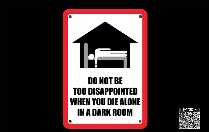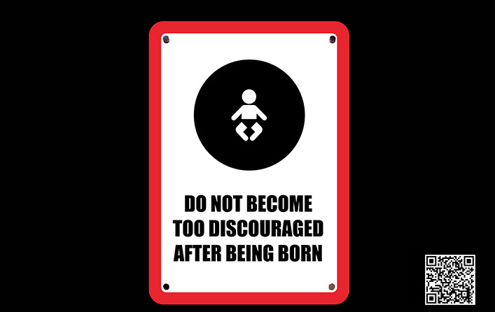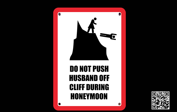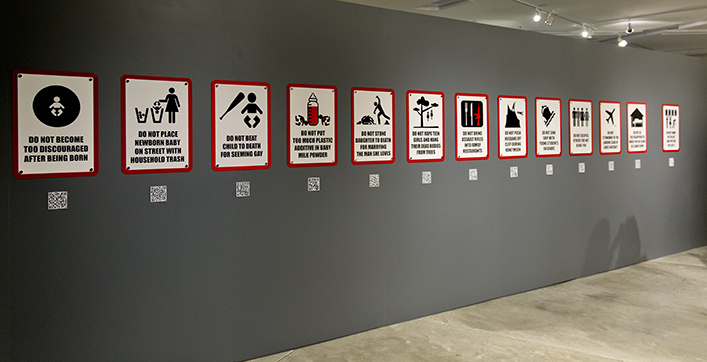 Unnecessary Signage A series of prints resembling metal road signs depict humanity’s struggle with morality and the human condition. Each sign is associated with a news event that occurred within the last 30 years, such as a woman who murdered her husband eight days after their marriage (Do Not Push Husband Off Cliff During Honeymoon). The QR code beneath each sign provides a link to the associated news article that viewers can access through their smartphones. |